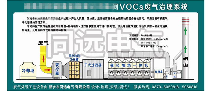 有机废气治理——车间的生产废气经管道收集后降温-静电吸附-过滤棉多重作用下进行预处理,预处理后废气进行活性炭吸附+催化燃烧脱附再生,处理后的废气经烟囱达标排放。